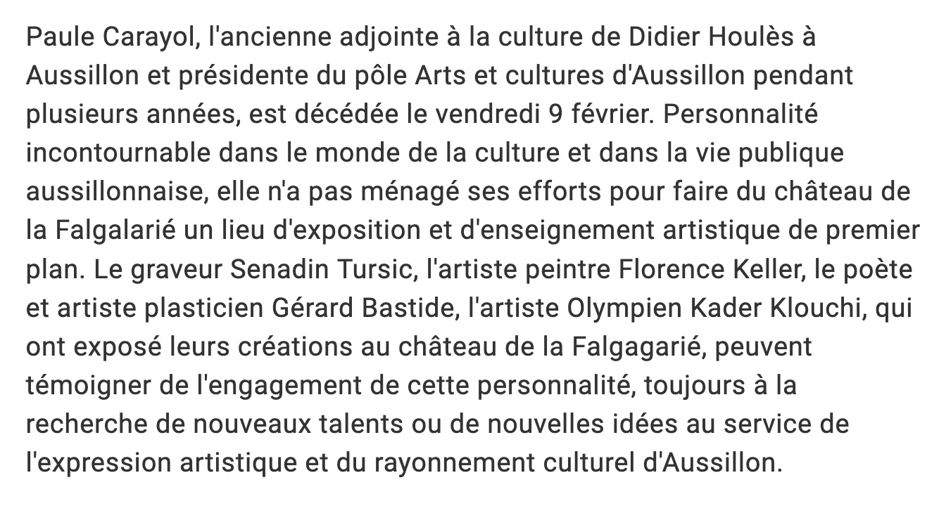 Paule Carayol, dite « Pau », est partie ce 9 février. Grande dame de la culture ! Tu te souviens, Pau, quand tu m’as confié, pour animer les festivités de l’an 2000, la tâche d’animer le lac des Montagnès, 2700 mètres de circonférence, rien que ça ! J’avais passé le printemps à créer puis installer 157 pièces, bois, métal, récup… S’il y a un au-delà, nous tâcherons d’en faire un site in-con-tour-na-ble ! A bientôt Pau!